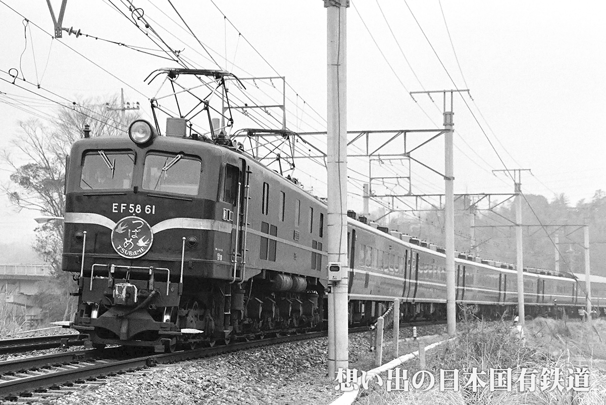 昭和28年7月の東海道本線・名古屋電化用として製造されたグループです。製造時の形態は、第2次形とほぼ同じで前面窓が大窓、水切り、誘導踏段、握り棒が無い姿でパンタはPS14でした。第2次形との差異は側窓の第1・第5が開閉可能となった点です。また、このグループには御召列車専用機として特殊装備を付けて製造された60・61号機も含まれます。 この61号機は60号機と共に製造前から御召列車専用機としての指定を初めて受けて製造されたものです。それまで御召し用機関車は既製の車輌中から出来栄え検査で選定されており、この面からも正真正銘、生まれながらの御召し専用機と言えましょう。 御召し列車用の特殊装備は以下の通りで、その他指示以外の部分についても特殊なテストを行うなど、メーカーの威信を掛けて製造されました。 運転室前面の飾り帯をステンレス製とし、車体側面全長に渡り幅70mmで取付。 連結器・タイヤ側面・バネつり・ブレーキ引棒などを磨き上げて傷の発見を容易にすると共に装飾とした。 車体両端に国旗掲揚装置を取付。 運転室側面下部に引き込み式の列車停止位置基準板を設置。 自動連結器に上錠揚止装置を取付。 供奉車との連絡電話を設置。 前後運転室間に連絡用の送話管を設置。 助士席にも速度計取付。 MG用界磁抵抗器を増設し、故障時に切り替え可能に。 応急処置用の予備品箱と工具箱を補機室内に用意。 ところで、あまり知られていないようですが、この61号機は本来日立製54号機として誕生する予定だったものが、「お召機は連番が望ましい」との観点から、このロット内で東芝に割り振られていた61号のナンバーを日立の54号と交換したものです。その為、54号機と61号機については同一メーカー内落成順ナンバー付番の法則が崩れています。 ※印…主な特徴です。画像をクリックすると大きなものが表示されます。 <一番下へ>