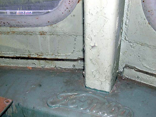 運転室前面窓付近。Toshibaの文字が何とも言えません。36号機はもともと大窓だったので、小窓化されたHゴム窓の下部に大窓時代の開口部を埋めた溶接の跡が残ってます。